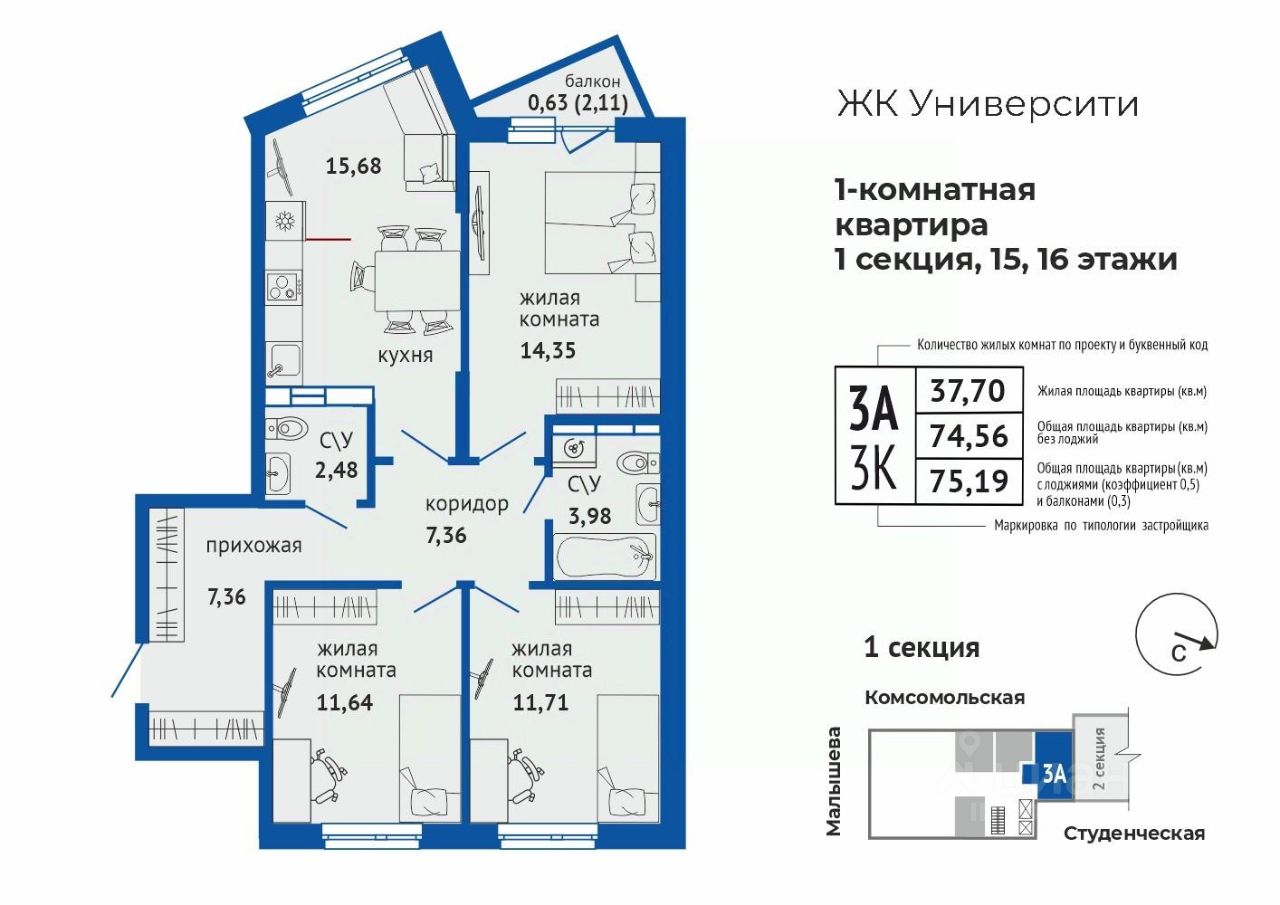 Продаётся 3-комнатная квартира в строящемся доме (Дом 1), срок сдачи: I-кв. 2028, общей площадью 75.19 кв.м., на 15 этаже. Новый жилой комплекс "Университи" от застройщика "Правобережный" расположен по адресу: г. Екатеринбург, Студенческая улица.