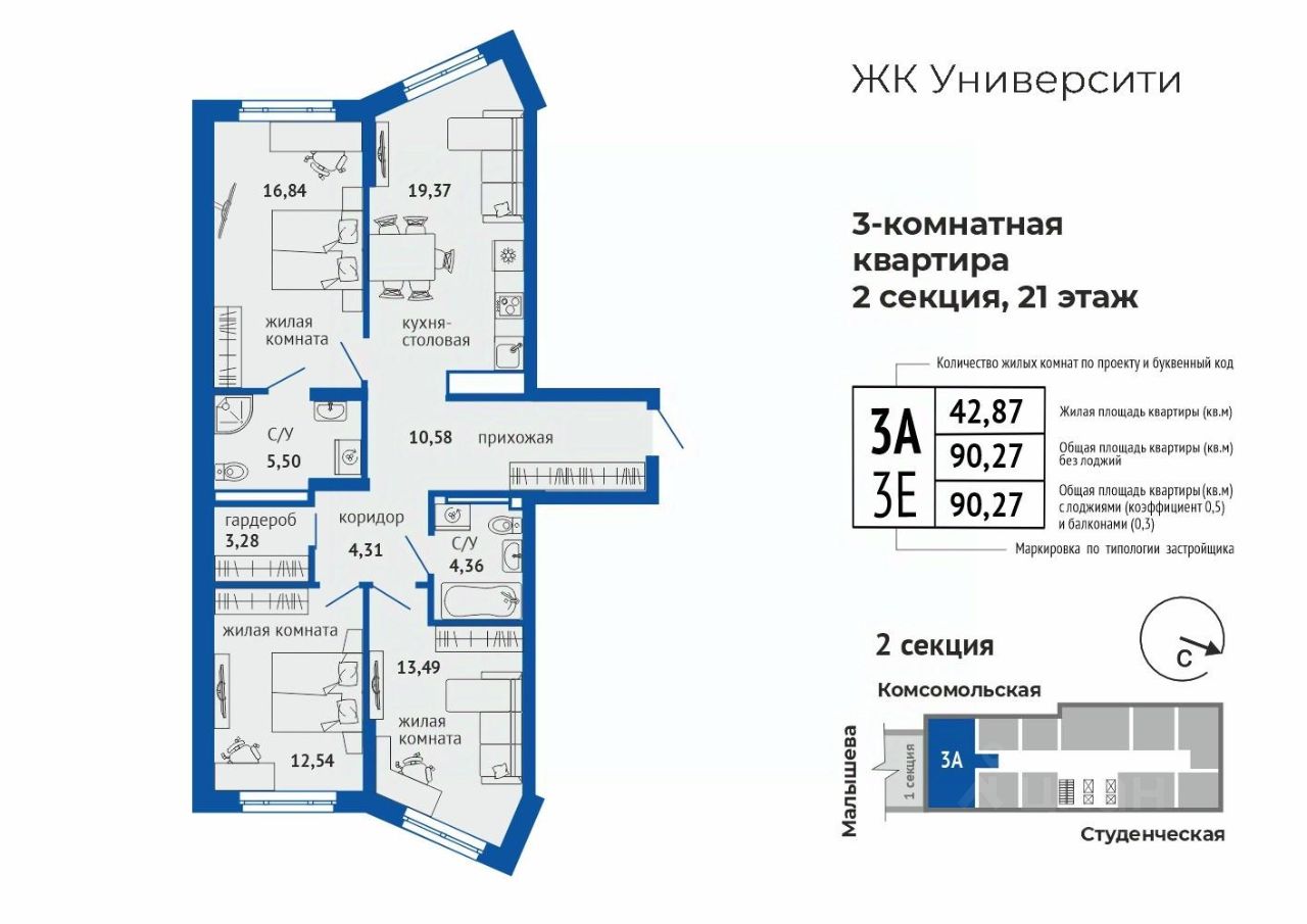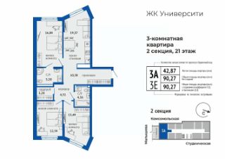 Продаётся 3-комнатная квартира в строящемся доме (Дом 1), срок сдачи: I-кв. 2028, общей площадью 90.27 кв.м., на 21 этаже. Новый жилой комплекс "Университи" от застройщика "Правобережный" расположен по адресу: г. Екатеринбург, Студенческая улица.