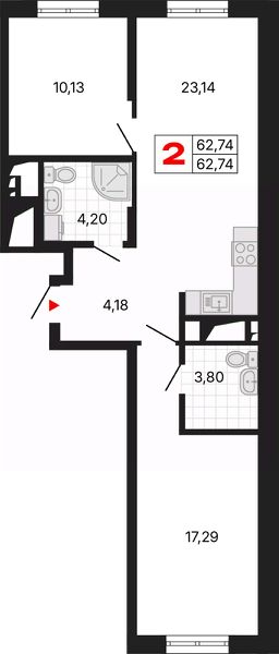 Просторная 2-комн. квартира с предчистовой отделкой в ЖК "Алиса" на 8 этаже. Общая площадь: 62.74 кв.м., жилая: 27.42 кв.м., площадь просторной кухни-столовой: 23.14 кв.м. Квартира - распашонка, без проходных комнат, окна выходят на paзные стороны дома. В квартире два совмещенных санузла. Высота потолков 2.72 м.