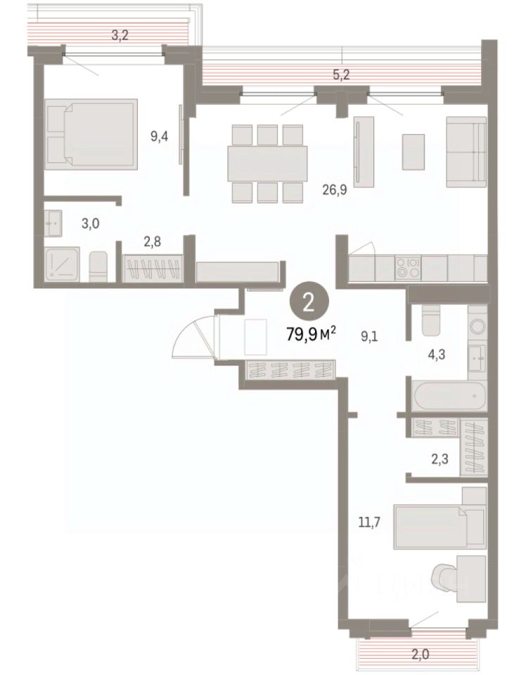 Квартира с кухней-гостиной и двумя спальнями в Бруснике в Академическом. Особенности планировки: мастер-спальня, окна на две стороны, предчистовая отделка.