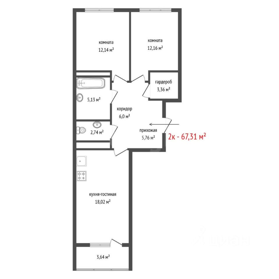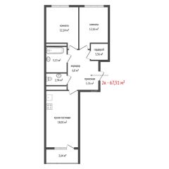 Большая кухня-гостиная с выходом на лоджию, непроходная грязная входная зона, два сан узла и планировка с изолированными комнатами.