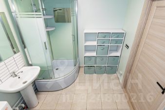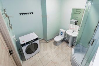 Ванная комната: стиральная машина с функцией сушки, современная душевая кабина, удобный стеллаж.