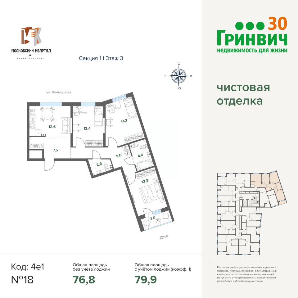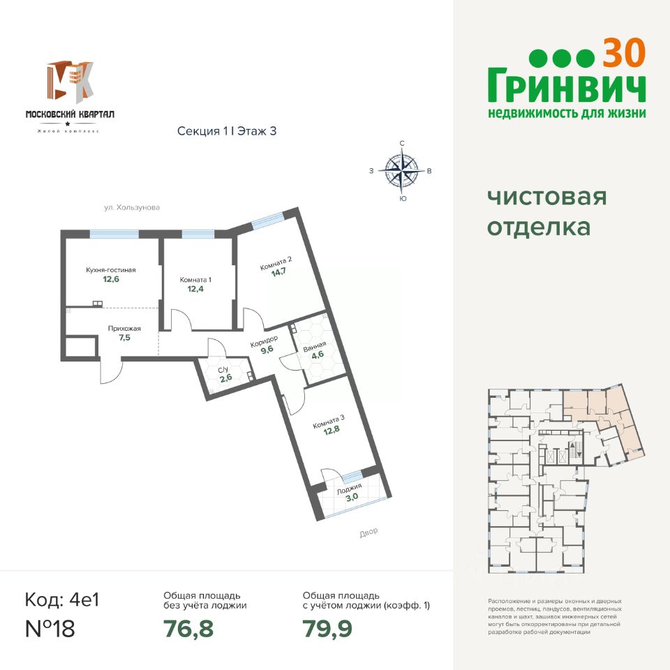 Продаётся 3-комнатная квартира в строящемся доме (Дом 12), срок сдачи: IV-кв. 2026, общей площадью 79.89 кв.м., на 3 этаже.