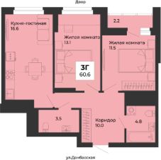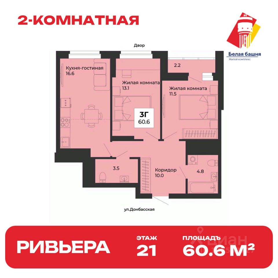 Общая площадь квартиры — 60.6 кв. м, этаж 21 из 25.