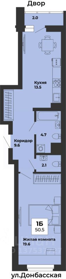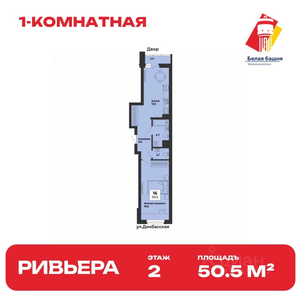 Общая площадь квартиры — 50.5 кв. м, этаж 2 из 25.