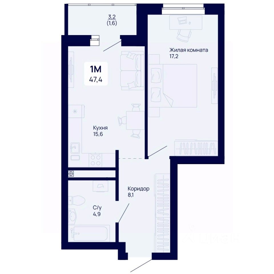 Общая площадь47,4 м²