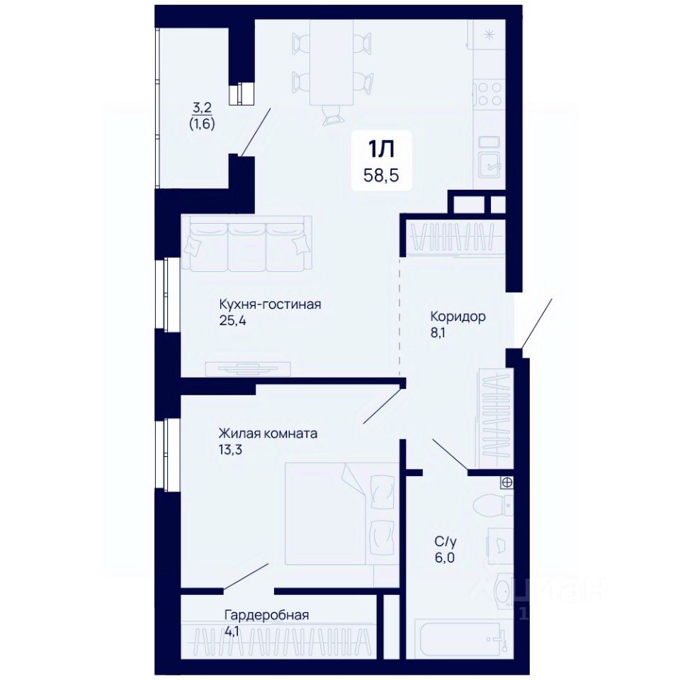 Общая площадь58,5 м²