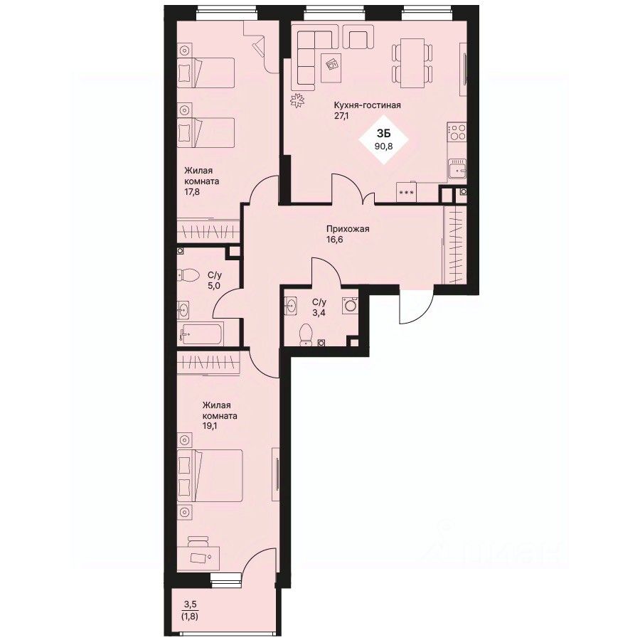 Общая площадь90,75 м²