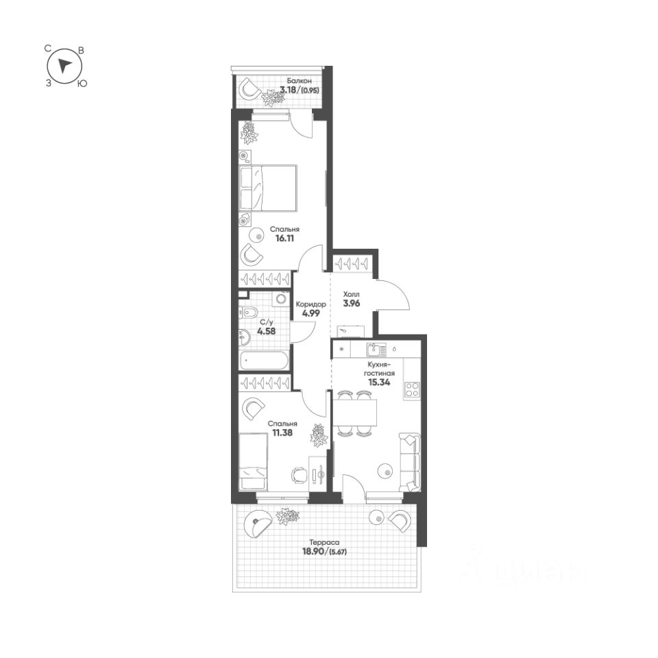 Продаётся 2-комнатная квартира в строящемся доме (Дом 6), срок сдачи: III-кв. 2028, общей площадью 62.98 кв.м., на 3 этаже. Проект застройки включает 9 жилых домов, 3 надземных многоуровневых паркинга почти на 900 машино-мест и встроенный детский сад для 165 детей. Общая площадь квартир составит порядка 90 тыс. кв. м, под коммерческие помещения отведено около 3500 кв. м. Участок имеет прямоугольную форму, что позволяет эффективно расположить все запланированные объекты и зонировать территорию. Строительство комплекса будет осуществляться поэтапно, в формате девяти очередей.