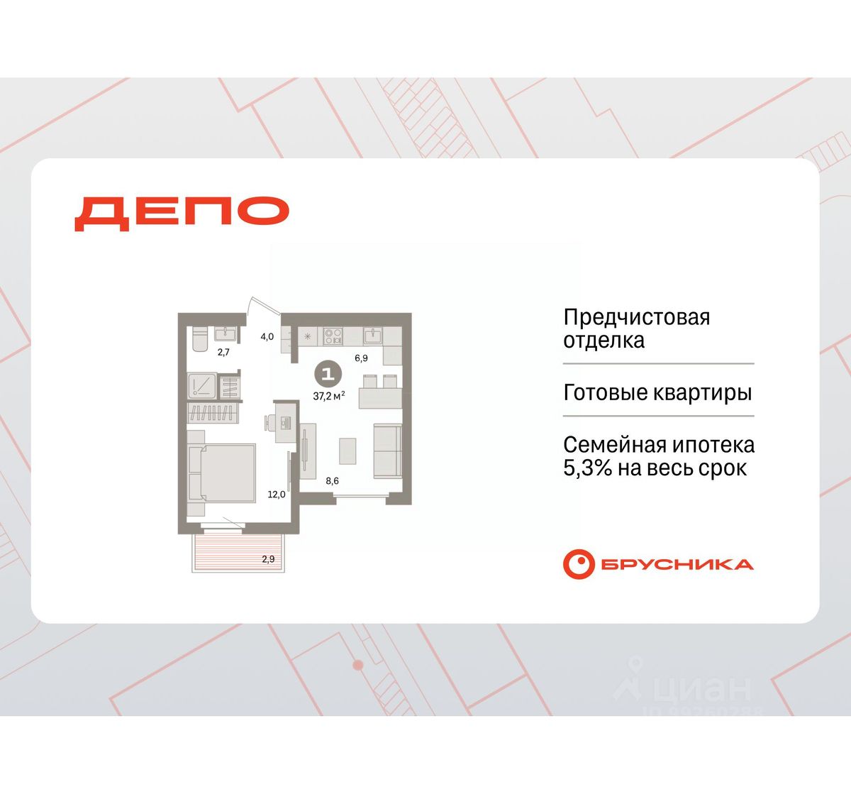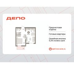 Квартира с кухней-гостиной и одной спальней в квартале "Депо". Особенности планировки: предчистовая отделка.