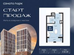 1-комн. квартира-студия с предчистовой отделкой в ЖК "Соната Парк" на 2 этаже. Общая площадь: 28.59 кв.м., площадь гостиной 16.89 кв.м., из которых 5.02 кв.м. выделено под кухонную зону. Все окна выходят на одну сторону. В квартире один балкон, один совмещенный санузел. Высота потолков 2.72 м.