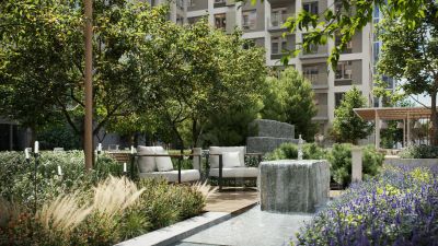 Благоустройство жилого комплекса это синтез искусства и природы. Поющие музыкальные инсталляции и поэтический променад. Оркестр растений: сирень, гортензии и яблони, чья цветущая палитра сменяется в течение года.