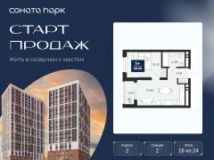 Просторная однокомнатная квартира с предчистовой отделкой в ЖК "Соната Парк" на 16 этаже. Общая площадь: 37.65 кв.м., жилая: 12.43 кв.м., площадь просторной кухни-столовой: 15.93 кв.м. Все окна выходят на одну сторону. В квартире одна лоджия, один совмещенный санузел. Высота потолков 2.72 м.