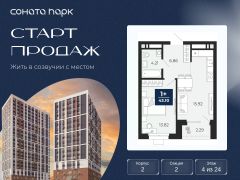 Продается однокомнатная квартира от застройщика с предчистовой отделкой в ЖК "Соната Парк" на 4 этаже. Общая площадь: 41.96 кв.м., жилая: 13.82 кв.м., площадь просторной кухни-столовой: 15.92 кв.м. Все окна выходят на одну сторону. В квартире одна лоджия, один совмещенный санузел. Высота потолков 2.72 м.