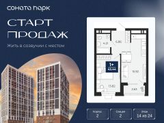 1-комн. квартира с предчистовой отделкой в ЖК "Соната Парк" на 14 этаже. Общая площадь: 42.13 кв.м., жилая: 13.82 кв.м., площадь просторной кухни-столовой: 15.92 кв.м. Все окна выходят на одну сторону. В квартире одна лоджия, один совмещенный санузел. Высота потолков 2.72 м.
