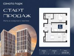 2-комн. квартира от застройщика с предчистовой отделкой в ЖК "Соната Парк" на 13 этаже. Общая площадь: 61.31 кв.м., жилая: 28.09 кв.м., площадь просторной кухни-столовой: 18.67 кв.м. Комнаты изолированные, все окна выходят на одну сторону. В квартире одна лоджия, один совмещенный санузел. Высота потолков 2.72 м.