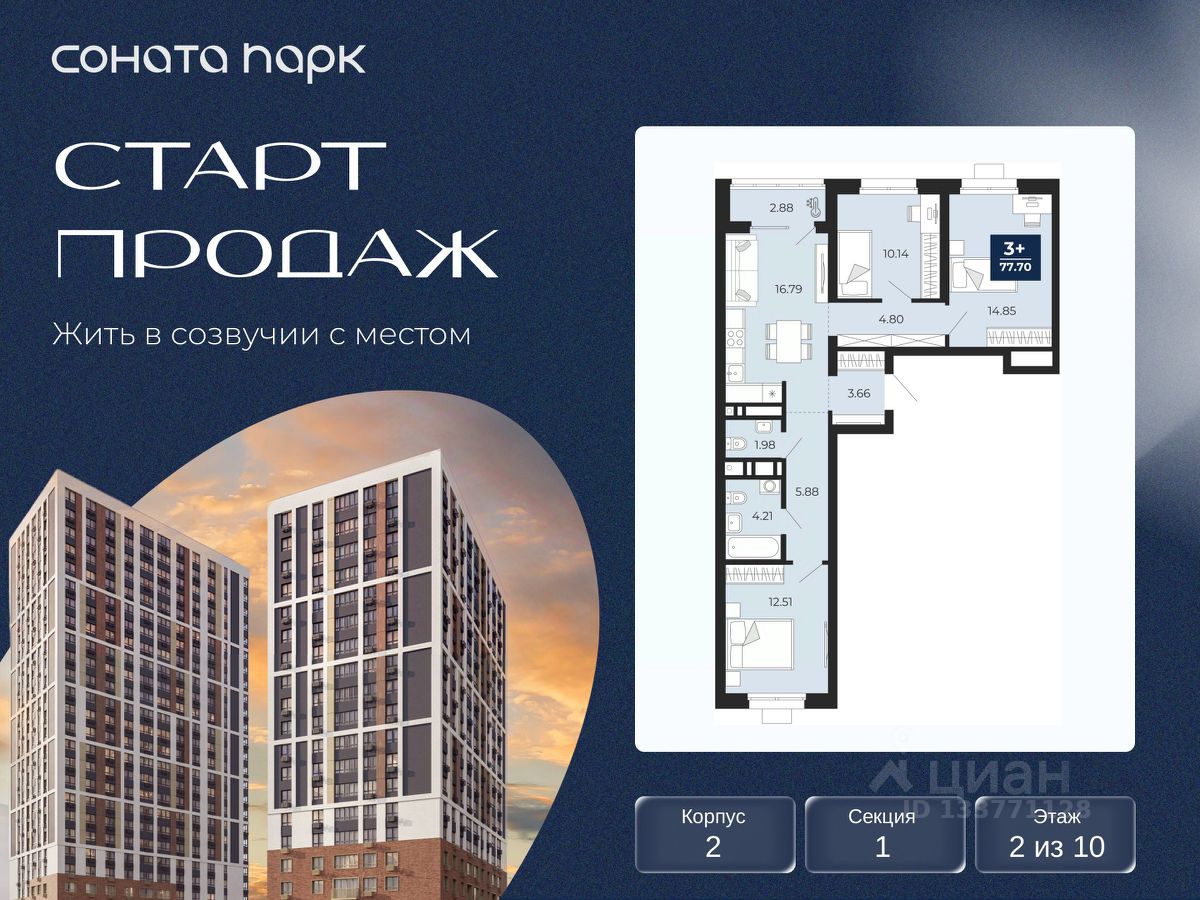 Трехкомнатная квартира с предчистовой отделкой в ЖК "Соната Парк" на 2 этаже. Общая площадь: 76.26 кв.м., жилая: 37.5 кв.м., площадь просторной кухни-столовой: 16.79 кв.м. Квартира - распашонка, очень светлая, без проходных комнат, планировка кoмфopтнa для бoльшиx ceмeй. В квартире одна лоджия, один совмещенный и один раздельный санузел. Высота потолков 2.72 м.
