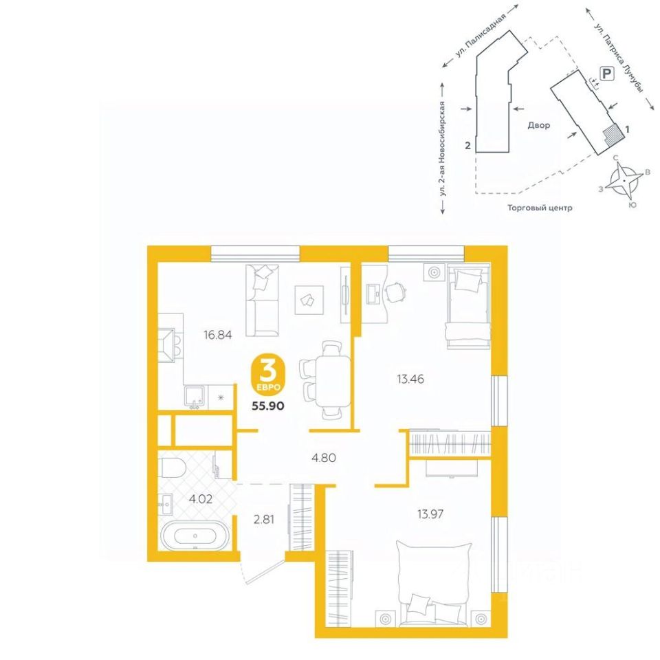 Квартира находится в ЖК "Бодровский" от федерального застройщика "Паритет Девелопмент". Это жилой комплекс комфорт-класса с современной архитектурой, расположенный в Екатеринбурге в районе улиц Патриса Лумумбы и 2-й Новосибирской.
