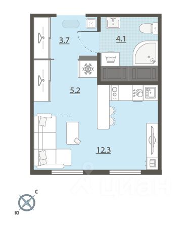 Жилая площадь 12.3 м2, кухня 5.2 м2, чистовая отделка. Раздельных санузлов - нет, балконов - нет, лоджий - нет.