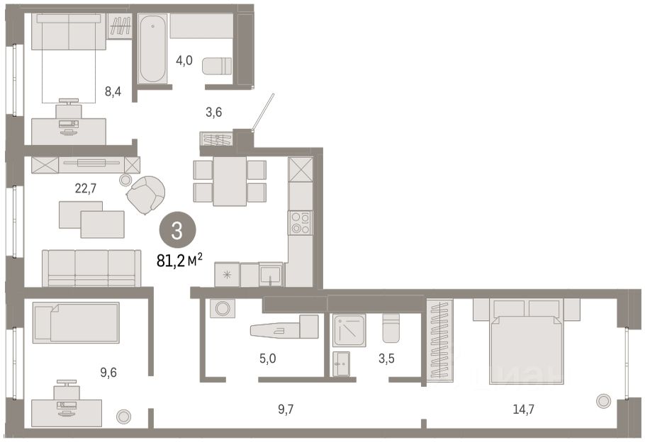 Квартира с кухней-гостиной и тремя спальнями в Южных кварталах. Особенности планировки: второй санузел, окна в пол, окна на две стороны, предчистовая отделка.