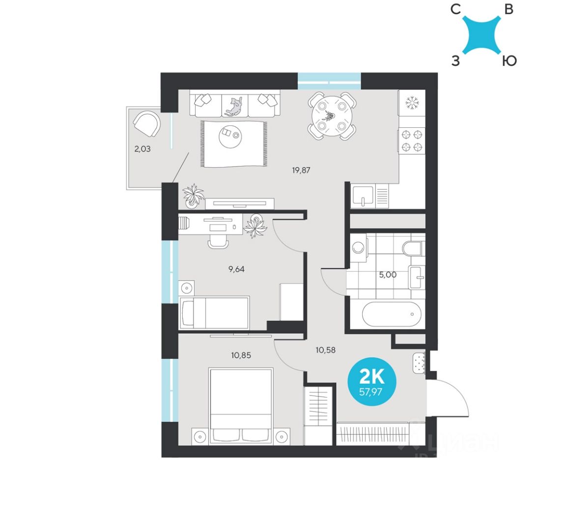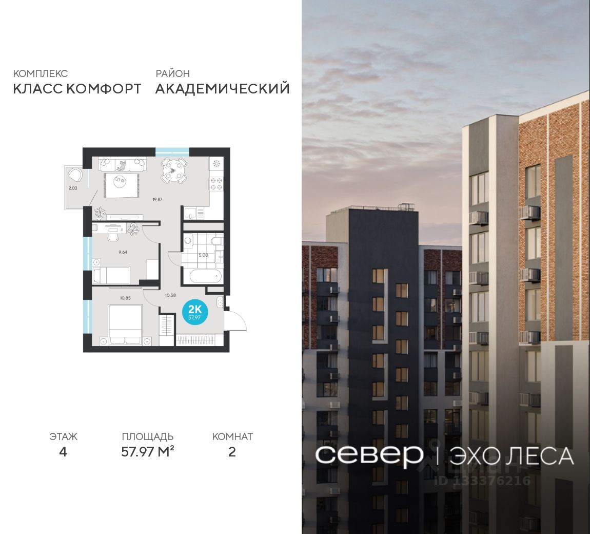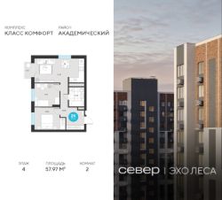 Продаётся квартира площадью 57.97 м2 в жилом комплексе "Эхо леса".