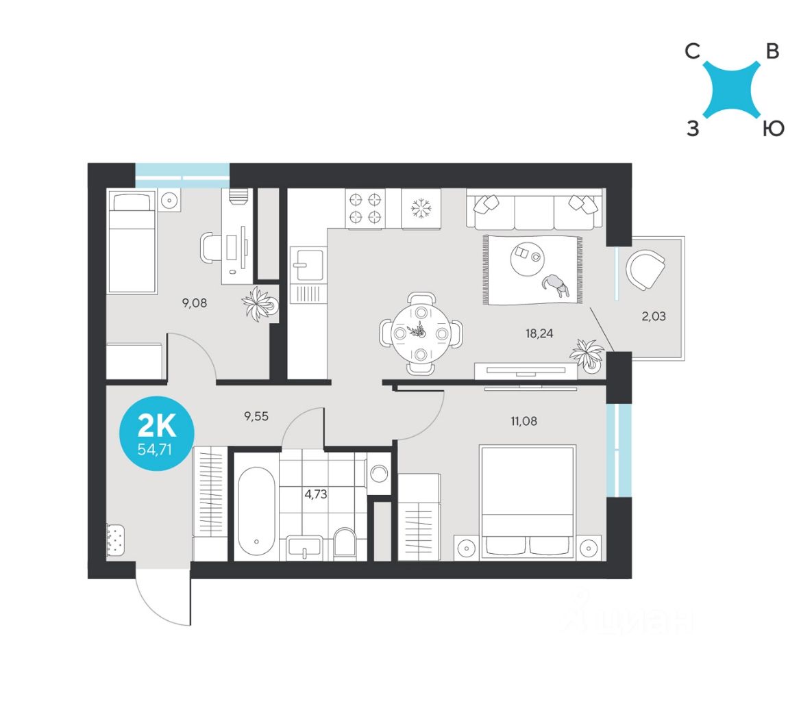 Продаётся квартира площадью 54.71 м2 в жилом комплексе "Эхо леса".
