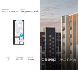 Продаётся квартира площадью 26.99 м2 в жилом комплексе "Эхо леса". Квартира находится на 2 этаже, жилая площадь квартиры 13.51 м2, площадь кухни-ниши — м2.