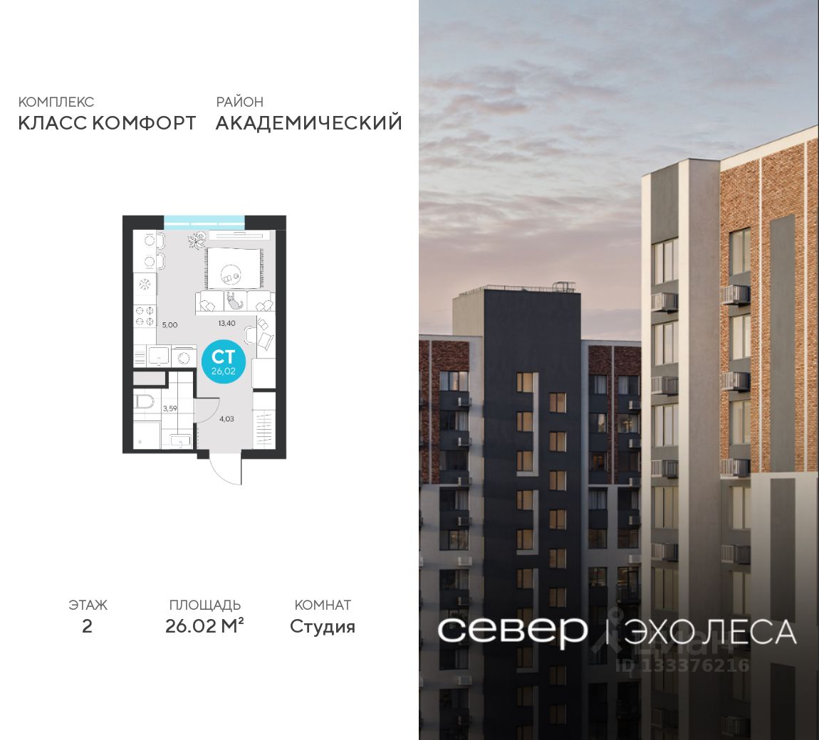 Продаётся квартира площадью 26.02 м2 в жилом комплексе "Эхо леса". Квартира находится на 2 этаже, жилая площадь квартиры 13.4 м2, площадь кухни-ниши — м2.