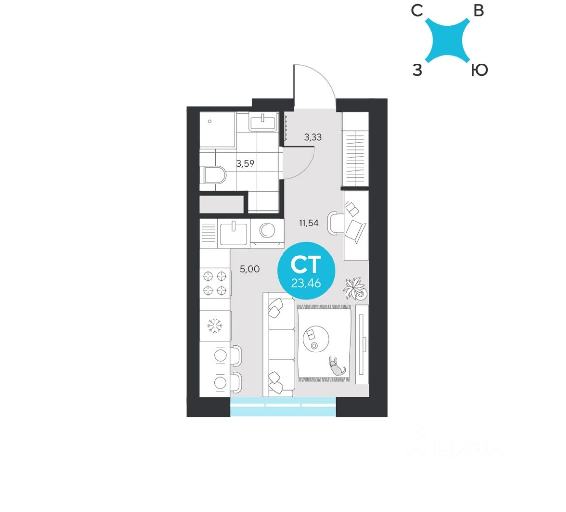 Продаётся квартира площадью 23.46 м2 в жилом комплексе "Эхо леса". Квартира находится на 7 этаже, жилая площадь квартиры 11.54 м2, площадь кухни-ниши — 5 м2.