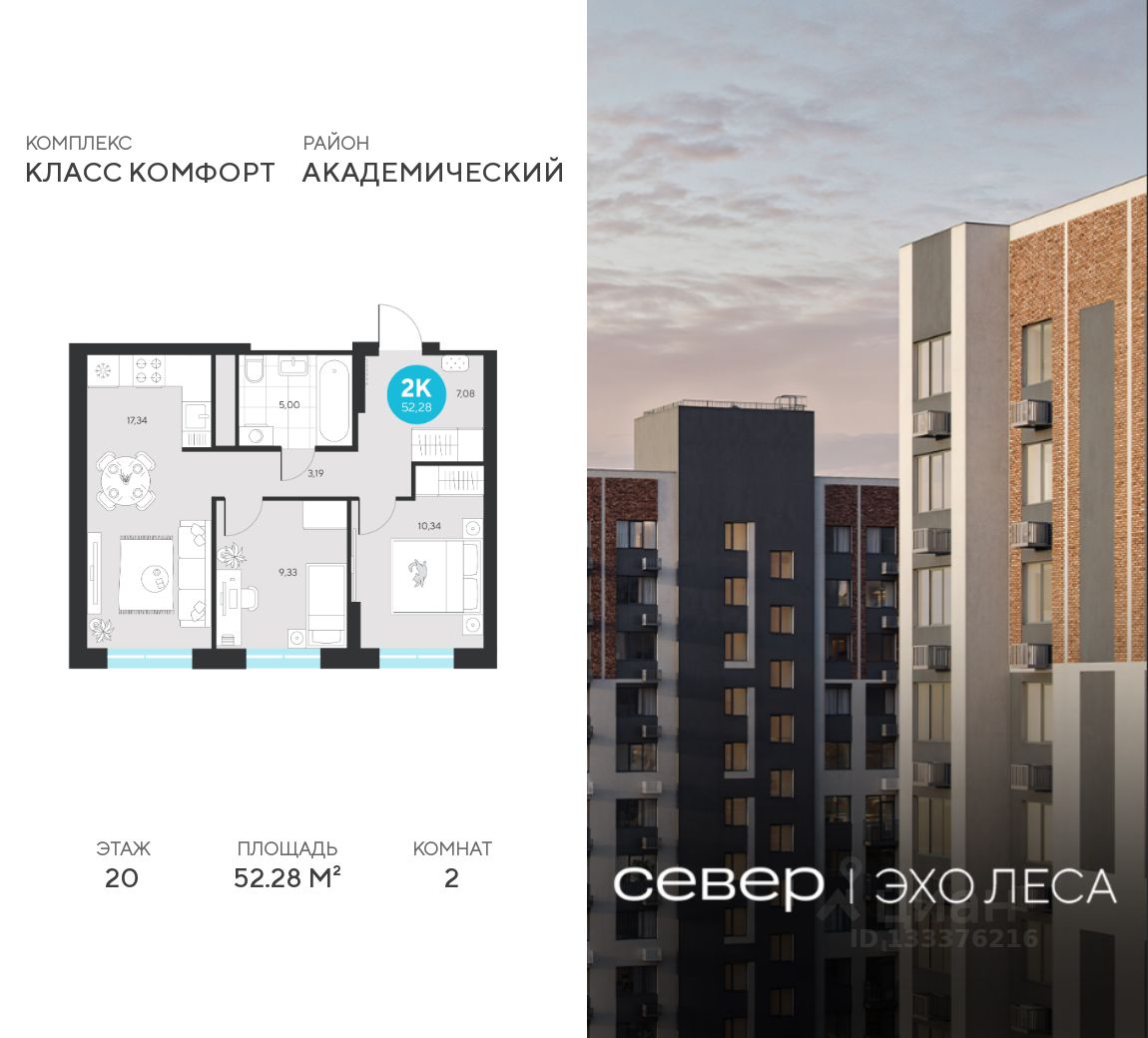Продаётся квартира площадью 52.28 м2 в жилом комплексе "Эхо леса".