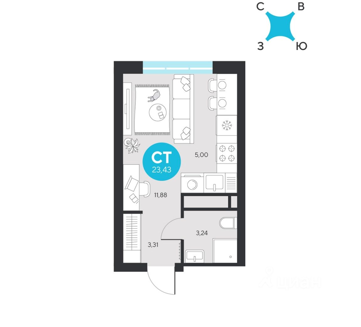 Продаётся квартира площадью 23.43 м2 в жилом комплексе "Эхо леса". Квартира находится на 9 этаже, жилая площадь квартиры 11.88 м2, площадь кухни-ниши — 5 м2.