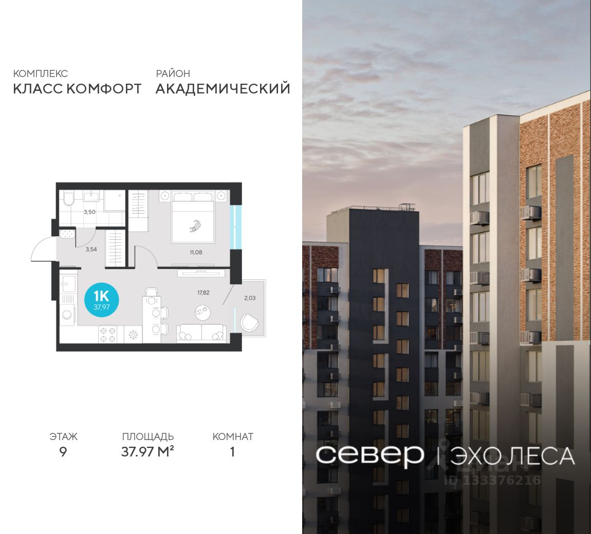 Продаётся квартира площадью 37.97 м2 в жилом комплексе "Эхо леса".