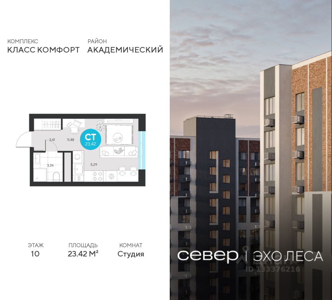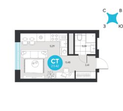 Продаётся квартира площадью 23.42 м2 в жилом комплексе "Эхо леса". Квартира находится на 10 этаже, жилая площадь квартиры 11.48 м2, площадь кухни-ниши — 5.29 м2.