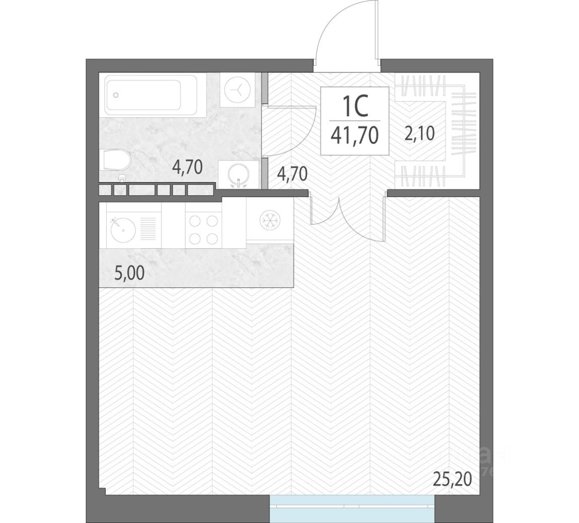 Квартира находится на 4 этаже, жилая площадь квартиры 25.2 м2, площадь кухни-ниши — 5 м2.