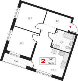 Продаётся квартира в Клубный дом "Московский Квартал", 12 дом. 2-комнатная квартира, 57,44 м², 144. Стоимость указана с учетом чистовой отделки.