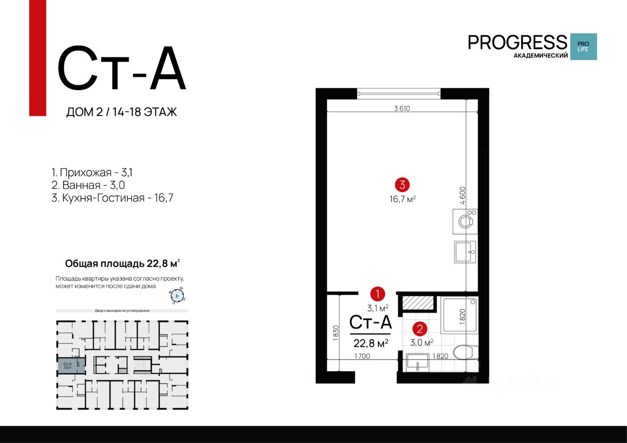 О компании: "Прогресс" — девелопер федерального уровня. Создаём современный стиль жизни с 2012 года. Совершенствуем культуру нашего общества. Предвосхищаем ваши ожидания. "Прогресс" - группа компаний полного цикла. Мы проектируем, строим и обслуживаем свои жилые комплексы. Входим в топ - 10 застройщиков по потребительским качествам ЖК по версии "Единый ресурс застройщиков". Мы - обладатель федеральных и европейских наград в сфере недвижимости: Urban Awards, European Property Awards, "Надёжный застройщик России" и др. Новый проект от создателей жилого квартала "Amundsen" "Progress Академический" - это место, где безопасно и уютно. Вы прочувствуете настоящую жизнь в режиме "здесь и сейчас". Удобная локация делает этот проект максимально привлекательным для тех, кто устал от суеты и ограниченных пространств. Безопасный благоустроенный двор, умные планировки и зонирование территории все это позволит почувствовать новый уровень комфорта. Соседство с лесным массивом, улучшает качество воздуха и создает уникальное экологически чистое окружение. Умные планировки. При проектировании дома наши архитекторы закладывают систему SMART- планировок: - Только разумное распределение полезной площади, которое отвечает реальным потребностям человека. Жители экономят деньги на протяжение всей жизни, ведь используется каждый уголок квартиры. - Несущие стены вынесены по периметру квартиры. Это дает возможность осуществлять перепланировку и реализовывать свои архитектурные идеи. - Все комнаты правильной формы, что упрощает расстановку мебели. Благоустроенные дворы. Наполнение двора детально продумано, с учетом потребностей каждого жителя. Детские площадки для разных возрастов, зоны отдыха, зеленые аллеи и пешеходные дорожки. В центре двора предусмотрен амфитеатр для общих встреч жителей и больших мероприятий. Собственная сервисная компания 24/7 поддерживает чистоту территории жилого квартала. Безопасность. Комплексная безопасность является одним из главных преимуществ. Проектом предусмотрено: закрытая придомовая территория без машин и круглосуточное видеонаблюдение без слепых зон, доступ через специальное мобильное приложение. Удобная локация. Инфраструктура обеспечит комфортную жизнь каждому. Это пространство с уникальной образовательной, спортивной и культурной инфраструктурой, необходимой для развития всесторонней личности. Парки и прогулочные зоны Продуктовые магазины "Пятерочка" и "Магнит" Тренажерные залы и фитнес-клубы 4 школы 9 детских садов Остановки общественного транспорта в 10 минутах ходьбы Технические преимущества: - система очистки водопроводной воды до питьевой - система телеметрии - установлены входные двери с тепло-шумоизоляцией - радиаторы отопления - наружные стены с встроенной шумоизоляцией - фасадная дренажная система позволяет избежать затопления фасадов и образования грязевых луж. Способы приобретения квартиры: • С помощью материнского капитала • В ипотеку Забронируйте квартиру по номеру телефона офиса продаж.