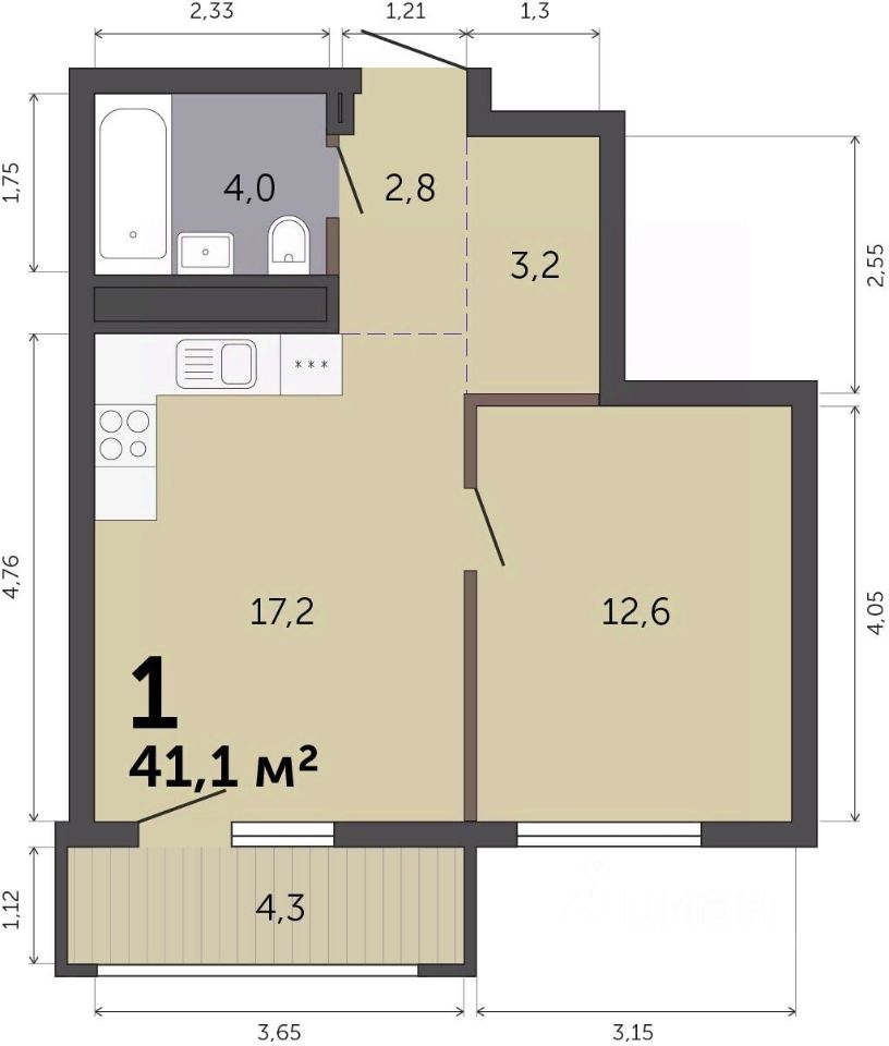 Общая площадь41,1 м²