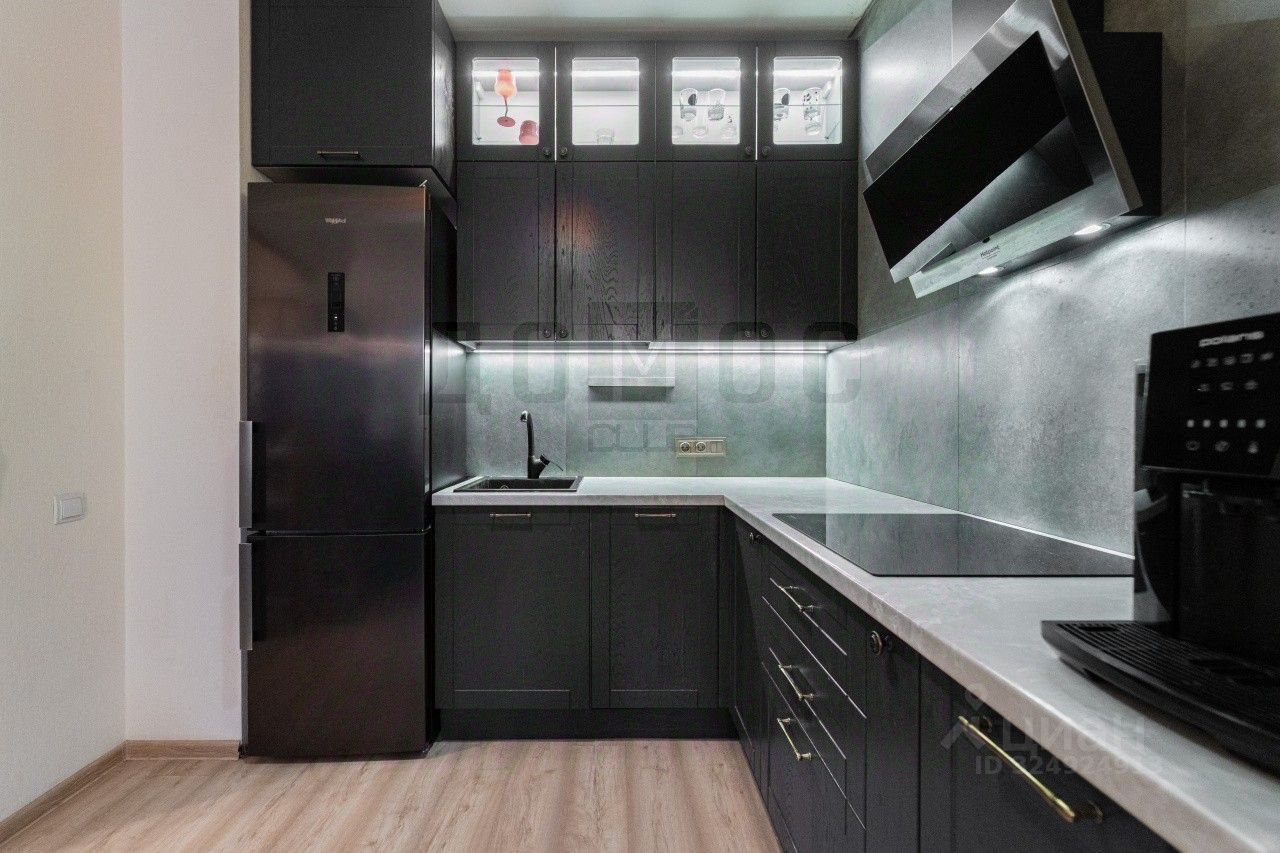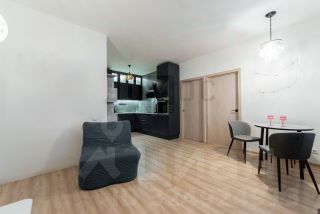 Кухня-гостиная находится в центре квартиры и идеально подходит для семейных вечеров и встреч с друзьями. Она оснащена современным кухонным гарнитуром и просторными шкафами, что делает интерьер стильным и функциональным.