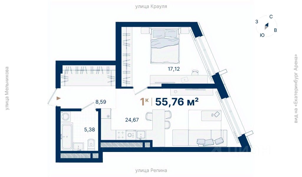 Дома расположены на стрелке улиц Репина и Крауля, рядом со стадионом "Екатеринбург Арена". Здесь уже есть все необходимое для жизни: сады, школы, поликлиники и магазины.