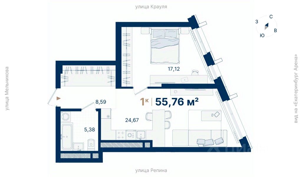 Дома расположены на стрелке улиц Репина и Крауля, рядом со стадионом "Екатеринбург Арена". Здесь уже есть все необходимое для жизни: сады, школы, поликлиники и магазины.