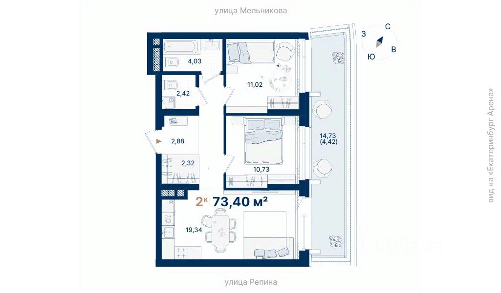Дома расположены на стрелке улиц Репина и Крауля, рядом со стадионом "Екатеринбург Арена". Здесь уже есть все необходимое для жизни: сады, школы, поликлиники и магазины.
