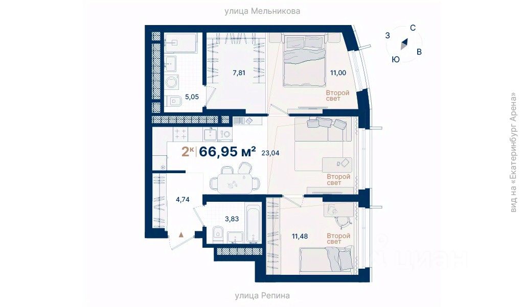 Дома расположены на стрелке улиц Репина и Крауля, рядом со стадионом "Екатеринбург Арена". Здесь уже есть все необходимое для жизни: сады, школы, поликлиники и магазины.