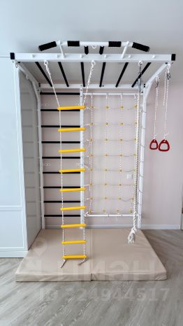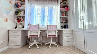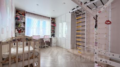 Встроенная детская рабочая зона, выполненная у окна, с большим столом, тумбами, полками. Встроенный большой шкаф. Спортивный комплекс.
