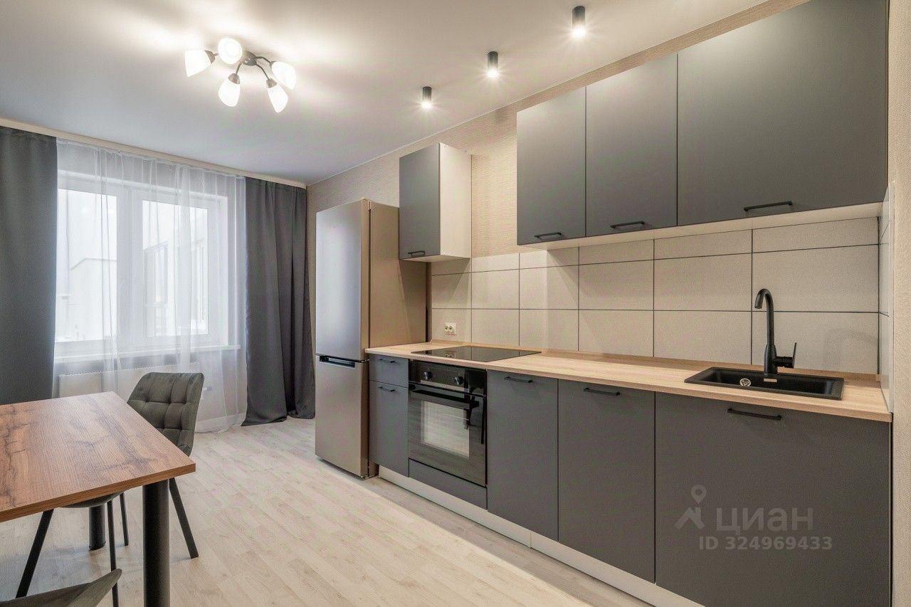 Кухня большой площадью 14 кв м - установлен новый функциональный кухонный гарнитур с техникой (варочная поверхность и духовой шкаф), двухкамерный холодильник, обеденный стол с креслами.