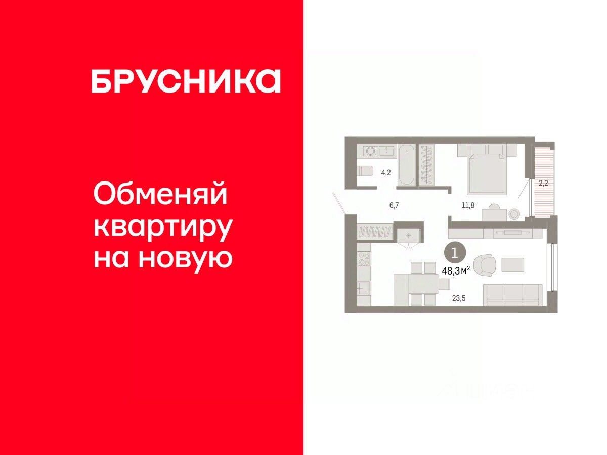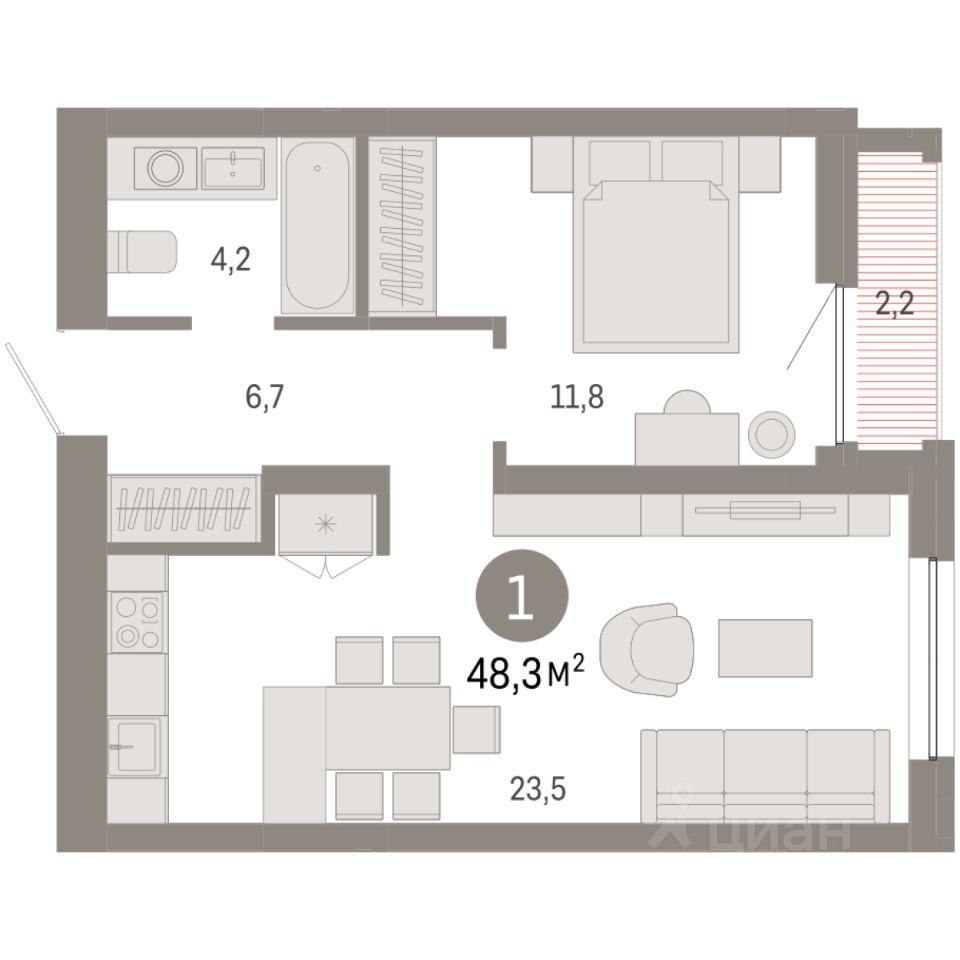 Квартира с кухней-гостиной и одной спальней в Южных кварталах. Особенности планировки: предчистовая отделка.