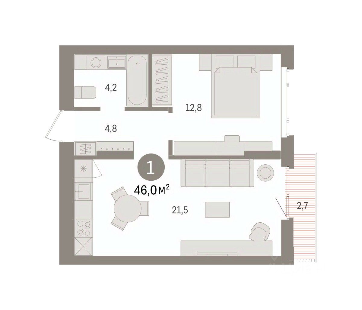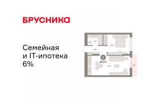 1-комн. квартира с предчистовой отделкой в ЖК "Квартал Траектория" на 2 этаже. Общая площадь: 46 кв.м., жилая: 12.8 кв.м., площадь просторной кухни-столовой: 21.5 кв.м. Все окна выходят на одну сторону. В квартире один балкон, один совмещенный санузел. Высота потолков 2.82 м.