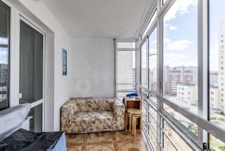 Огромная застеклённая лоджия - безопасное дополнительное пространство для отдыха. Окна выходят во двор.