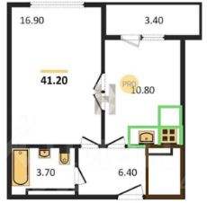 Общая площадь квартиры составляет 41.2 кв. м, из которых 16.9 кв. м отведено под жилую зону и 10.8 кв. м занимает просторная кухня.