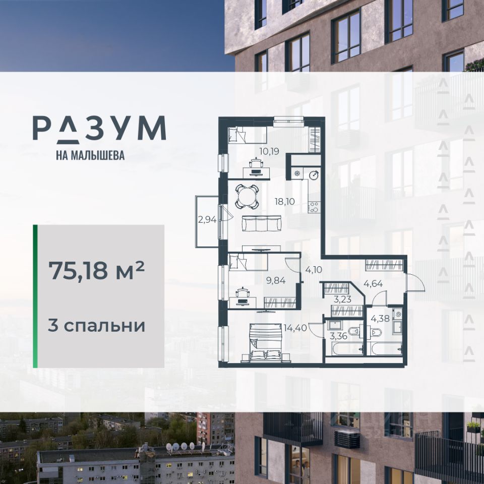 "РАЗУМ на Малышева" — новый проект от федерального девелопера с 12-летним опытом. Квартал расположен в самом сердце Екатеринбурга в Кировском районе. В шаговой доступности: 8 детских садов; 7 школ; прогулочные зоны и парки; магазины; учреждения профессионального образования. "РАЗУМ на Малышева" — это четыре 31-этажных башен на улице Малышева. Дополнительная приватность, безопасность и тишина создаётся за счёт возвышения домов на стилобате. Балконы на фасадах открывают виды на город и во двор, а угловые террасы открывают ещё больше простора и потрясающих видов. Жители квартала "РАЗУМ на Малышева" наслаждаются зелёными зонами круглый год. 60% территории занимает озеленение с деревьями, кустарниками и многолетниками. Здесь прогулки, отдых, работа и встречи с друзьями проходят в уютных зонах с перголами, шезлонгами и гамаками. "РАЗУМ на Малышева" — это: развитая инфраструктура; эргономичные и яркие архитектурные решения; дополнительный уровень спокойствия за счет возвышения на стилобате; во дворе высажены деревья и кустарники с учетом 4 сезонов; многоуровневое освещение; благоустройство; высокий уровень безопасности; стильные гранд-лобби и ресепшн; особые панорамные виды; собственная управляющая компания; собственный детский сад на 150 мест; четырёхэтажный паркинг; соседский центр место развития добрососедства; коммерческие помещения. Эргономичность и удобство в каждом квадратном метре — основа планировочных решений в квартале "РАЗУМ на Малышева". Для каждого сценария жизни найдется планировка: представлены десятки вариантов от 29,92 м² до 84,88 м². Квартиры с террасами размещены на верхних этажах домов. Терраса — это дополнительное пространство для слияния с природой.