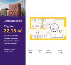 Однокомнатная квартира-студия с предчистовой отделкой в ЖК "Астон.Движение" на 3 этаже. Общая площадь: 22.15 кв.м., площадь гостиной 14.7 кв.м., из которых 5 кв.м. выделено под кухонную зону. Все окна выходят на одну сторону. В квартире один совмещенный санузел. Высота потолков 2.7 м.